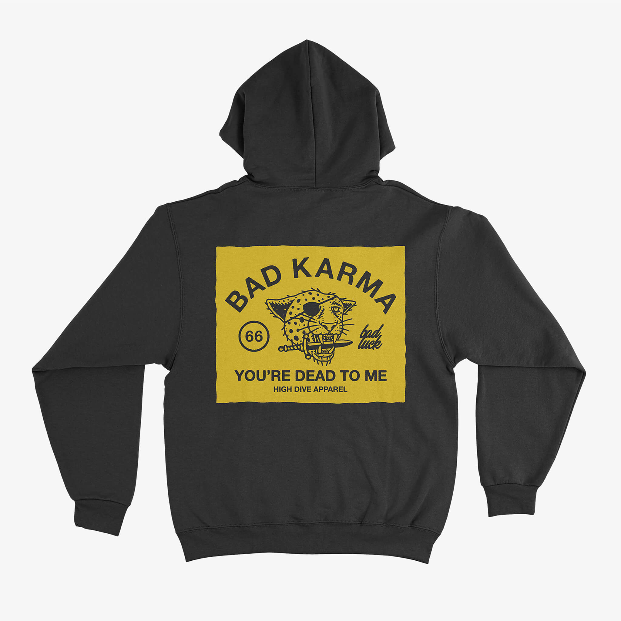 Don't let the name fool you - this graphic hoody is guaranteed to bring you nothing but good luck! Made from soft cotton, this Mid-weight 280gsm Drop-sholdered Hoodie is designed to keep you comfy and stylish. Featuring a big yellow back print with a classic 'your dead to me' quote!, a bad luck print on the front, it's the perfect way to show off your life!