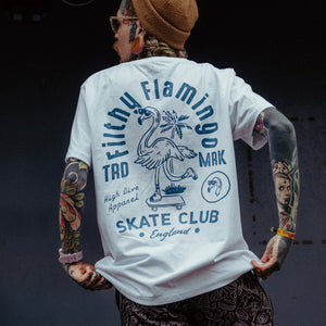 - Full Back print of our "Filthy Flamingo Skate Club" design, with Flamingo Head Printed on Front Chest