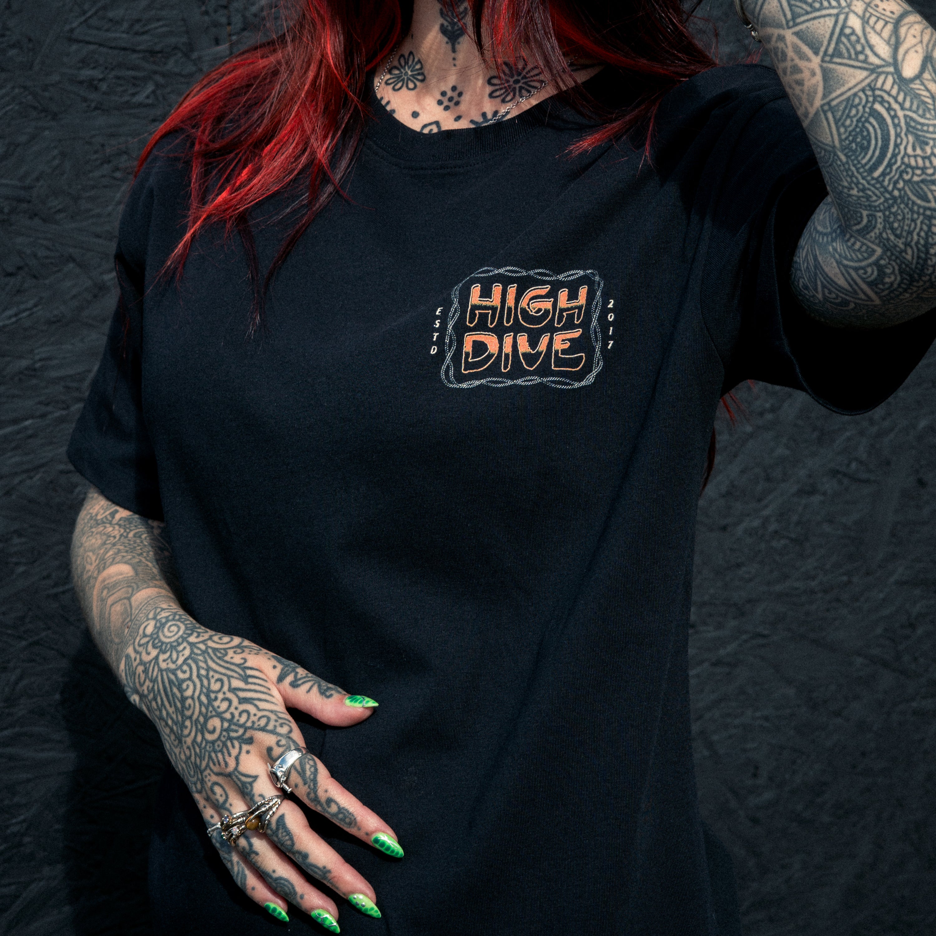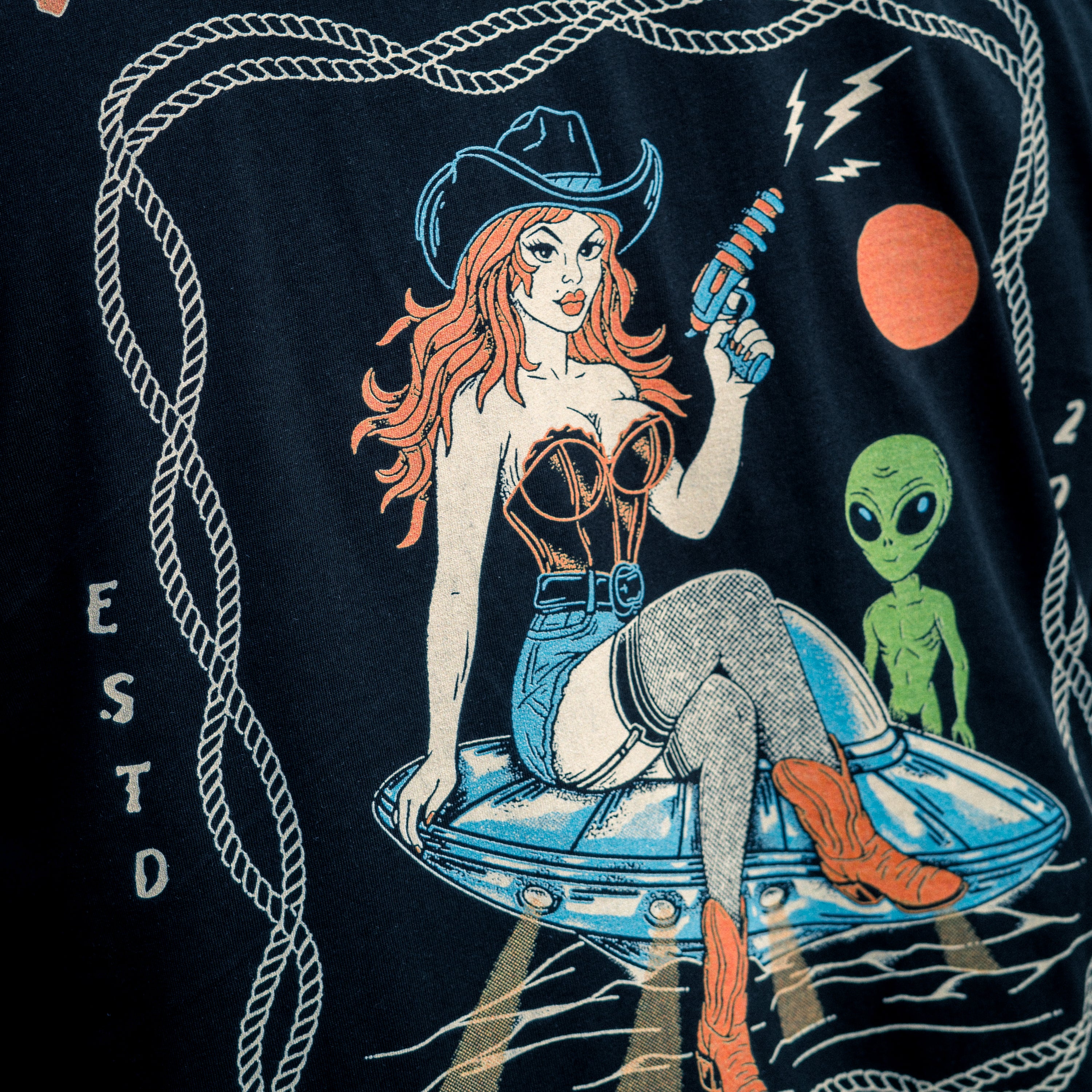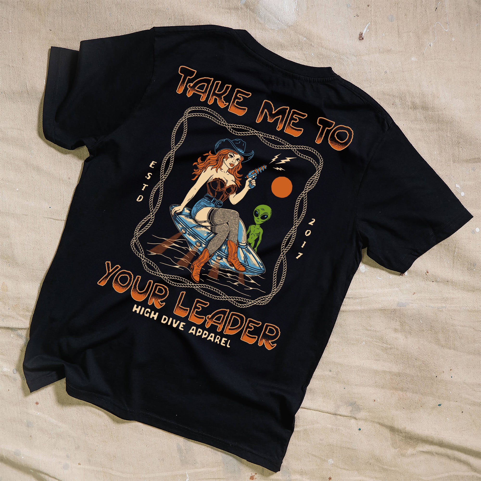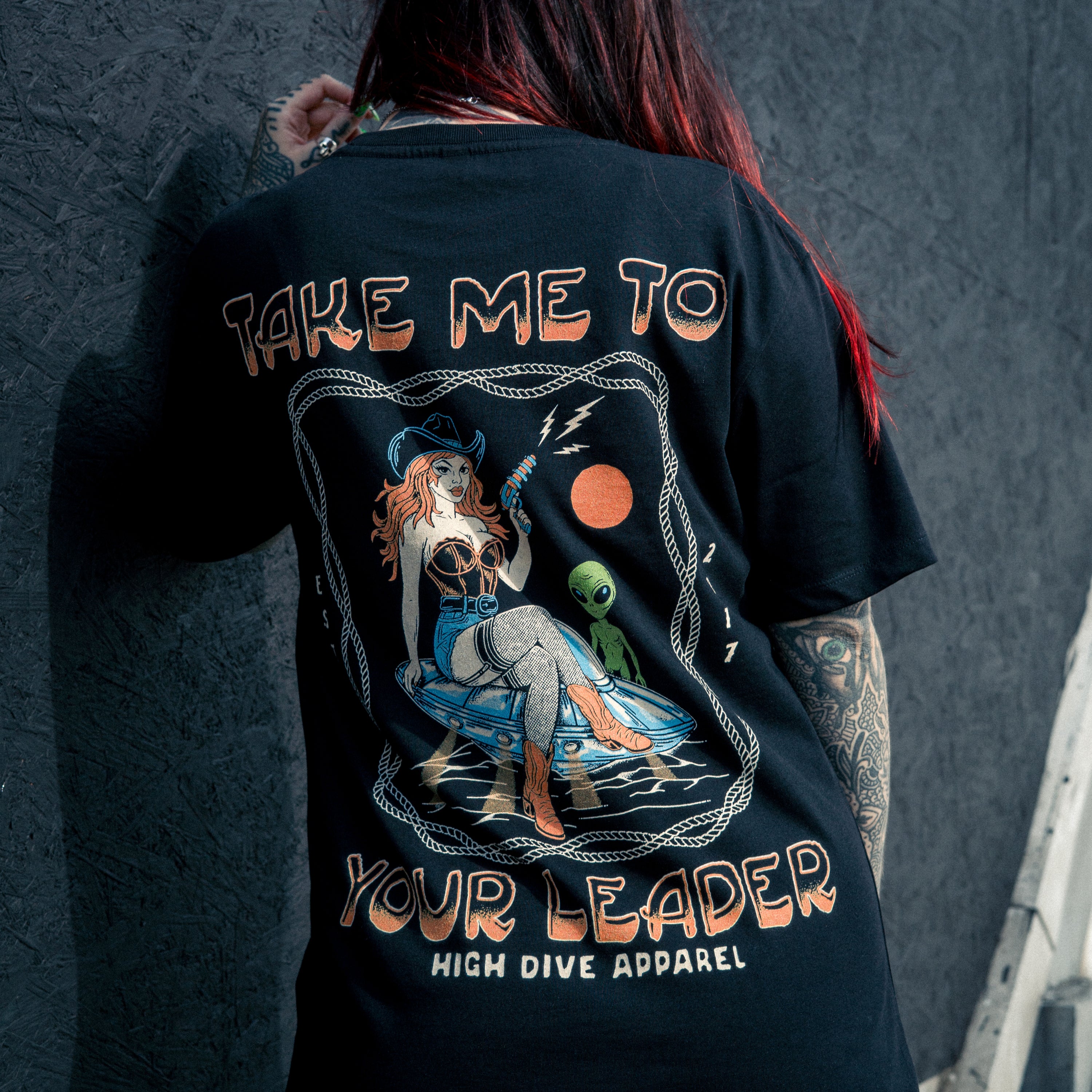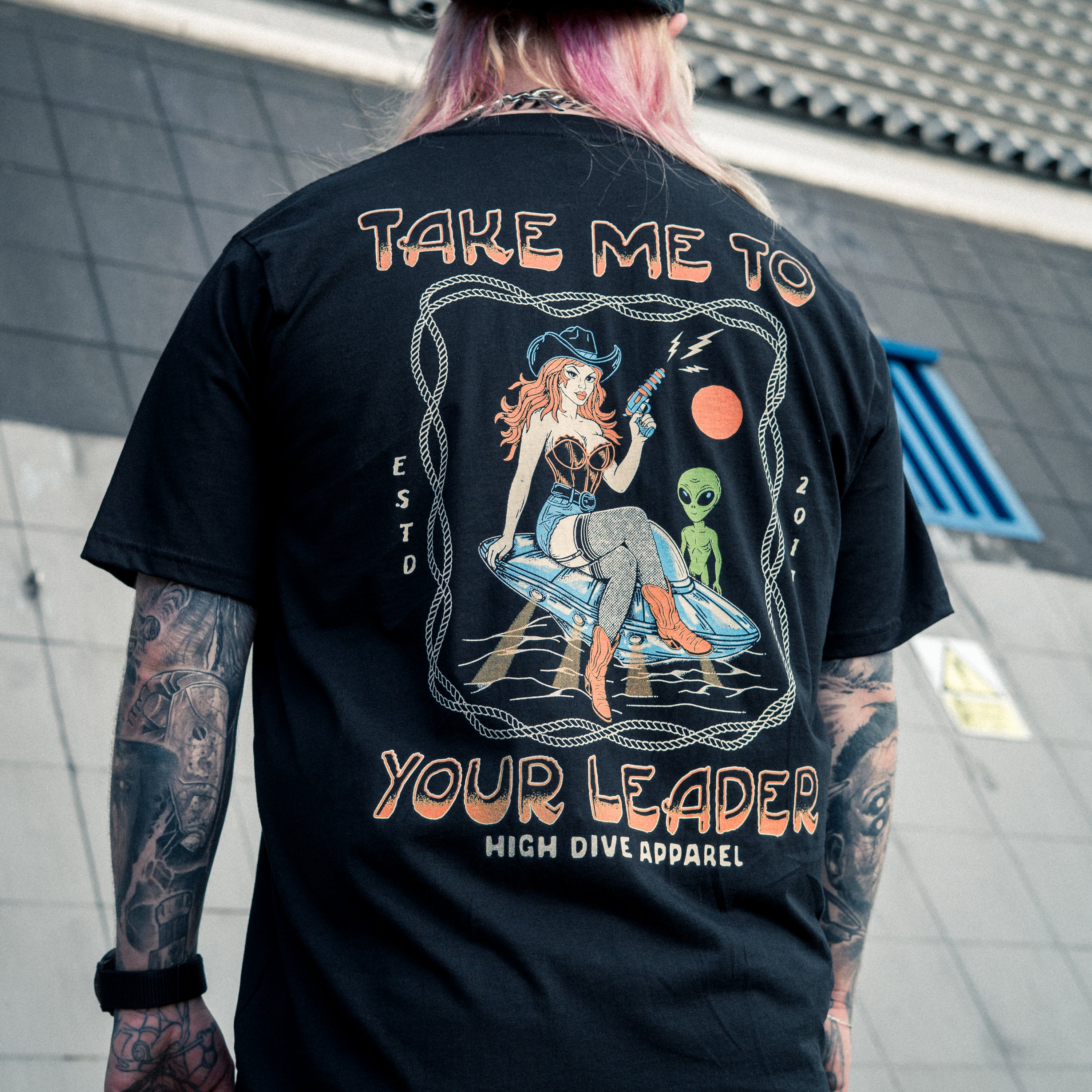 - Full Back print of our Take Me To Your Leader design, with the high dive Print on Front Chest