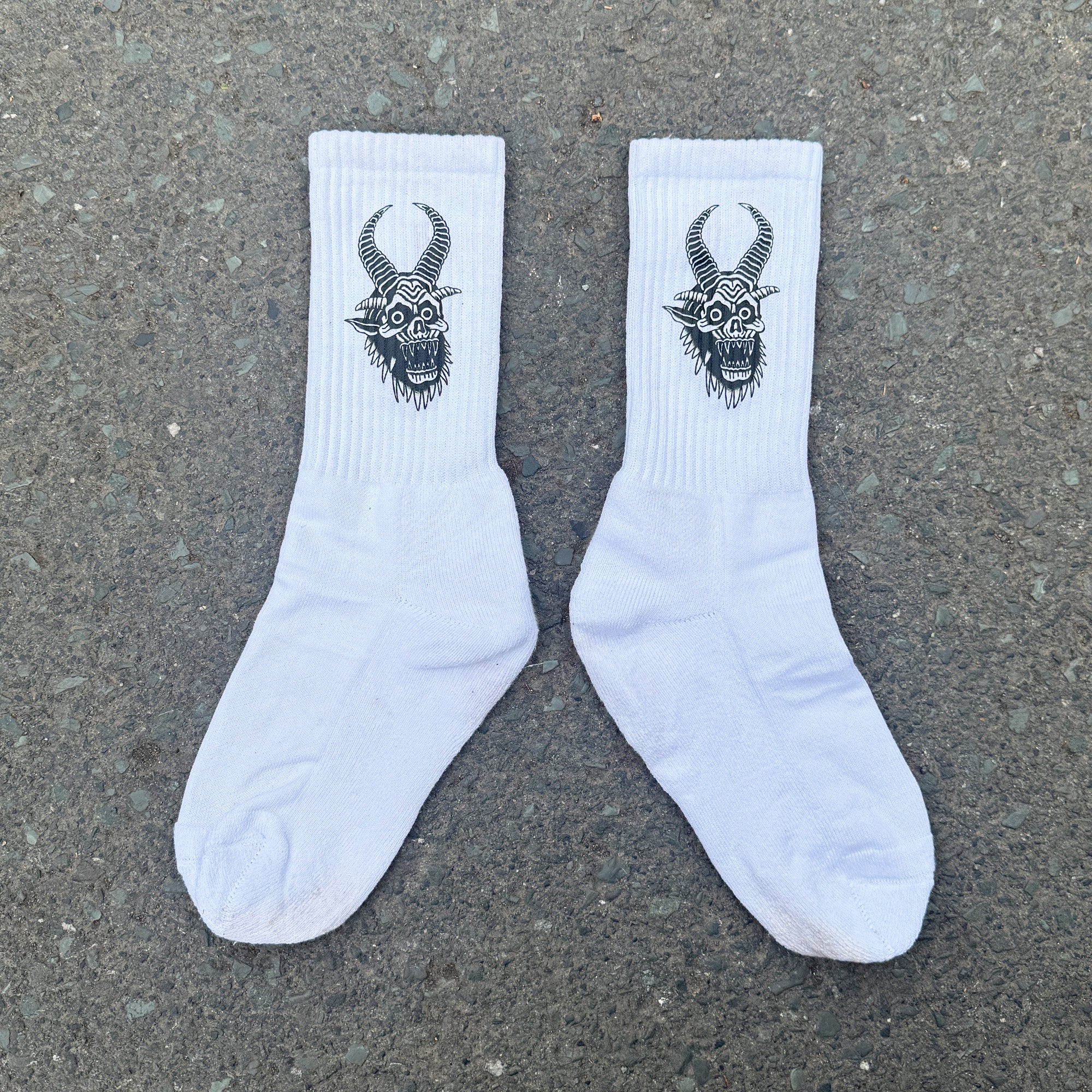 - A pair of soft cotton crew socks with our Krampus Design